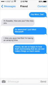 Now, by this calculation, I am totally a teenager, except, I’m not a teenager; I’m a writer and a blogger. Engagement in social media has become a fun—but occasionally timewasting—part of my work. At the same time, I also text all of the time, it is the only form of communication that doesn’t really intrude on somebody when their busy. It also gives the other person the opportunity to reply when they are available. I wrote this blog in order to help families and friends connect to their gapper in Israel, while at the same time provide information on easy ways to communicate.